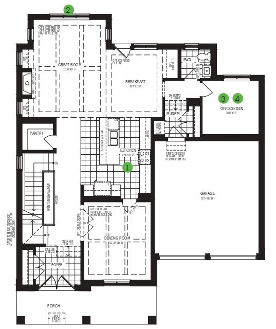 Great room with optional fireplace and coffered ceiling